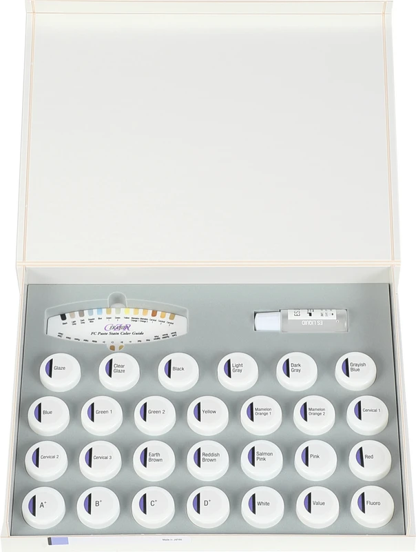 Die Erweiterung einer neuen Malfarbenpaste für Oberflächen zu der CERABIEN ZR-Serie ermöglicht eine einfache Charakterisierung von Vollzirkon-Restaurationen. FC Paste Stain ist verfügbar in insgesamt 27 Schattierungen, für die Reproduktion einer Vielzahl von Farben. Die Ergänzung zu den Blue und Gray Farben (Light Gray, Dark Gray, Grayish Blue, & Blue) ermöglicht eine einfache Reproduktion der gräulichen Transparenzeffekte für den Inzisalbereich. Zwei Glasurarten (Glaze & Clear Glaze) vereinfachen die Kontrolle über die Transparenz der gesamten Krone.