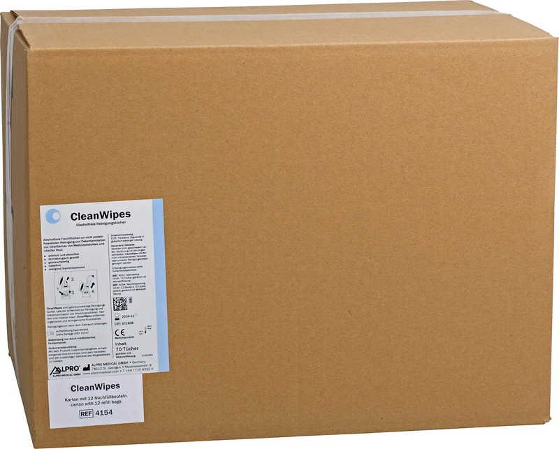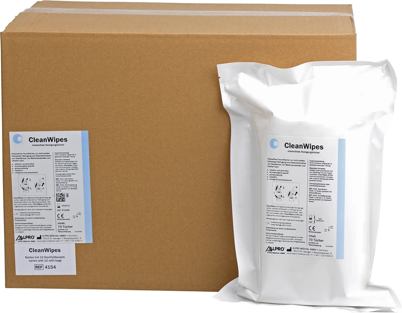 Alkoholfreie Feuchttücher zur nicht proteinfixierenden Reinigung und Dekontamination von Oberflächen von Medizinprodukten und intakter Haut. Die bakteriostatisch und fungistatisch wirkenden CleanWipes in Cotton touch Qualität entfernen leicht und schonend organische und anorganische Anschmutzungen von Medizinprodukten, Händen und intakter Haut. CleanWipes sind dermatologisch geprüft.