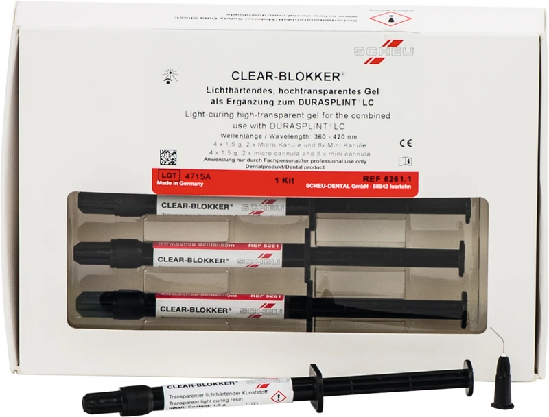 Packung 4 x 1,5 g CLEAR-BLOKKER, 2 Kanülen Ø 0,4 mm, 8 Kanülen Ø 0,9 mm