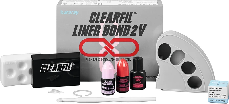 CLEARFIL LINER BOND 2V eignet sich für die Verarbeitung von allen licht-, chemisch- und dualhärtenden Kompositen, sowie von Amalgam. Es kann demnach als "Universalbonding" bezeichnet werden. Das Bondingsystem besteht aus einem selbstätzenden Zweikomponenten-Primer und einem Zweikomponenten-Bonding. Der Primer ermöglicht die gleichzeitige und schonende Behandlung von Schmelz und Dentin in einem Arbeitsschritt. Dabei erzeugt er eine optimale Haftkraft und vermeidet gleichzeitig postoperative Sensibilitäten. Während des üblichen Ätzvorganges kollabiert das freigelegte Kollagennetzwerk. Dies ist eines der Hauptprobleme bei konventionellen Bondingsystemen, da es zu einer geringeren Bondingstärke führt. Im Gegensatz dazu ist CLEARFIL LINER BOND 2V, im Hinblick auf das Zahngewebe, biokompatibel. Durch den schonenden Ätz- und Dekalzifikationseffekt des Primers sowie durch dessen Wassergehalt verbleibt das Kollagenfasernetzwerk in seiner natürlichen Form sowie in seinem natürlichen Volumen. Diese Eigenschaften von CLEARFIL LINER BOND 2V garantieren eine erfolgreiche Haftung am Zahn und an der Restauration.