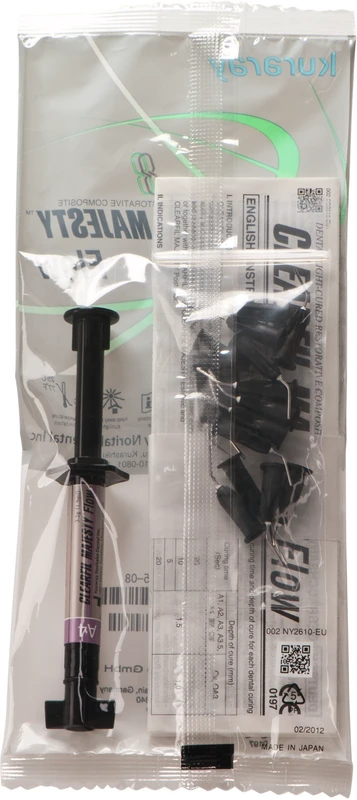CLEARFIL MAJESTY Flow ist ein dünnfließendes, gleichzeitig jedoch hochgefülltes, lichthärtendes, radioopakes Hybridkomposit mit einem Fülleranteil von 81 Gew. %. Dank einer neuen Oberflächenbeschichtung der Füllkörper gelingt es Kuraray gute Fließfähigkeit und hohen Füllstoffanteil zu vereinen und ein gut anfließendes Komposit mit physikalischen Eigenschaften eines Hybridkomposits herzustellen. (Druckfestigkeit von 329 MPa, Biegefestigkeit von 145 MPa, niedrige Polymerisationsschrumpfung von 1,9 %). Dank der innovativen Applikationsspritze lässt sich das thixotrophe Verhalten des Komposits perfekt und präzise steuern. Nach der blasenfreien Applikation verbleibt CLEARFIL MAJESTY Flowpunktgenau an der aufgetragenen Stelle ohne an der Applikationsspitze zu kleben oder Fäden zu ziehen.