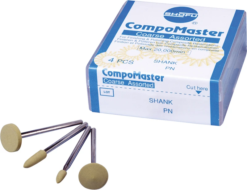 Die Silikonpolierer sind mit einer ausgewogenen Mischung reiner Diamantpartikeln imprägniert, haben eine lange Standzeit und eignen sich für die rasche Ausarbeitung und Politur von Komposit-Restaurationen sowie die Erzielung einer äußerst homogenen und glatten Oberfläche. Die unterschiedlichen Körnungen der groben CompoMaster Coarse in Kombination mit den feineren CompoMaster Polierern (mit gelber und weißer Schaftmarkierung) bilden ein effizientes Konzept für eine homogene Oberflächenbearbeitung. Die CompoMaster Coarse Polierer wurden entwickelt, um Kompositoberflächen zu konturieren und in einem Arbeitsgang vorzuglätten. Die so vorbereiteten Oberflächen werden dann mit den CompoMaster Instrumenten poliert.