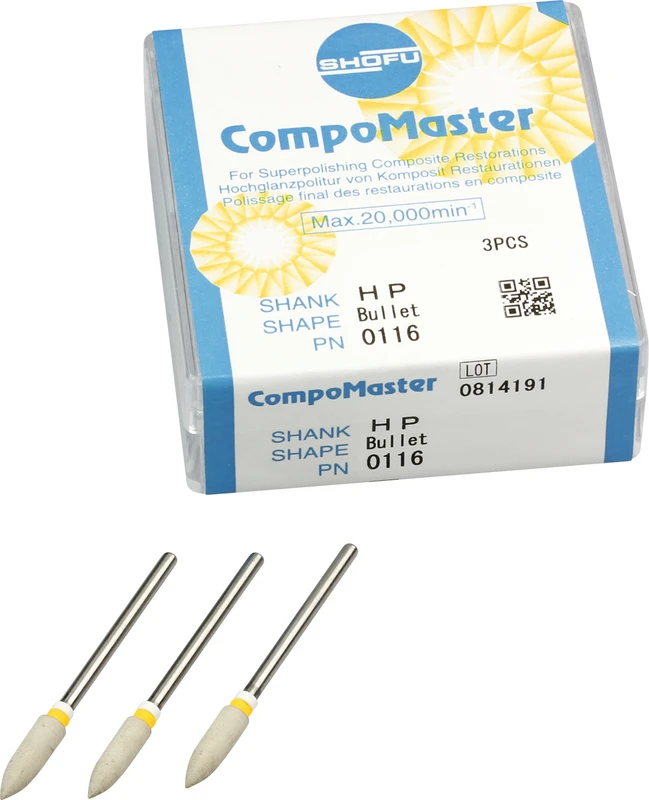 Die Silikonpolierer sind mit einer ausgewogenen Mischung reiner Diamantpartikeln imprägniert, haben eine lange Standzeit und eignen sich für die rasche Ausarbeitung und Politur von Komposit-Restaurationen sowie die Erzielung einer äußerst homogenen und glatten Oberfläche. Die unterschiedlichen Körnungen der groben CompoMaster Coarse in Kombination mit den feineren CompoMaster Polierern (mit gelber und weißer Schaftmarkierung) bilden ein effizientes Konzept für eine homogene Oberflächenbearbeitung. Die CompoMaster Coarse Polierer wurden entwickelt, um Kompositoberflächen zu konturieren und in einem Arbeitsgang vorzuglätten. Die so vorbereiteten Oberflächen werden dann mit den CompoMaster Instrumenten poliert.