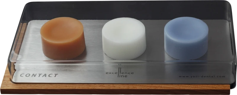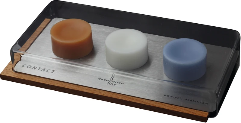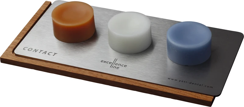 Set esthetik 1 Contact Basis, 2 x 20 g Modellierwachschip (blau transparent, orange transparent), 20 g Cervicalwachschip wood