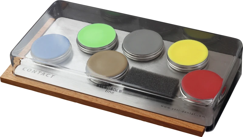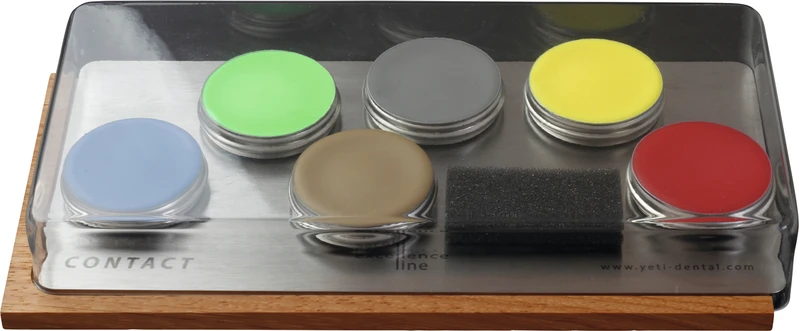 Set NAT 1 Contact Basis, 4 x 8 g Modellierwachs (blau, grau, neon-gelb, neon-grün), 8 g Unterziehwachs caramel. 8 g Cervikalwachs rot
