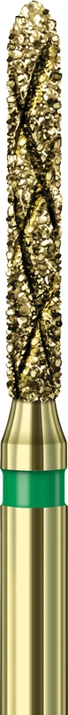 Die Oberfläche der COOL-DIAMANT-Schleifer ist durch asymmetrisch sich kreuzende Kanäle unterbrochen. Diese diamantierten Kanäle können zum einen eine erhöhte Menge Kühlflüssigkeit transportieren und unterbrechen zum anderen den Schleifvorgang bis zu 7 mal bei jeder Umdrehung des Schleifers. Beides fördert einen kühlen Schliff. Funktions- und formkongruente Instrumente in drei Körnungen für präzise aufeinander abgestimmte Präparationsschritte.