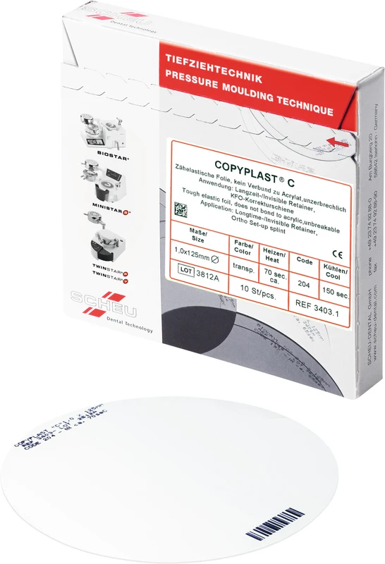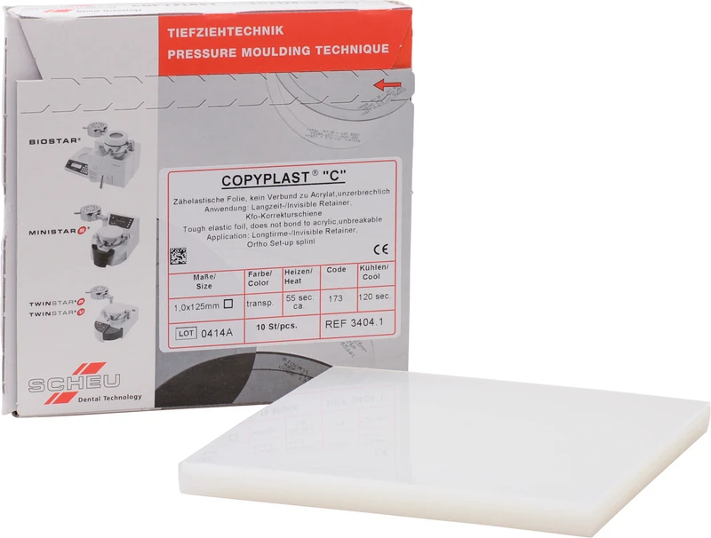 Hochtransparente, zähelastische, unzerbrechliche abrasionsfeste Folien, verbinden sich nicht mit Autopolymerisat. Langzeit- und invisible Retainer, KFO-Korrekturschienen.