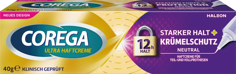 Träger von Teilprothesen berichten von einem festeren Halt mit Corega Ultra Haftcreme, sowohl bei Unterkiefer-, als auch bei Oberkiefer-Teilprothesen.
