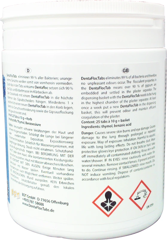 DentaFloc Tabs eliminieren 99 % aller Bakterien; unangenehme Gerüche werden somit von vornherein vermieden. Durch das in den Tabs wirksame DentaFloc setzen sich 90 % der Gips- und Einbettmasse im Klärbecken ab. Den Dosierkorb mit einem DentaFloc Tabs in die höchste Kammer des Gipsabscheiders hängen. Mindestens 1 x wöchentlich einen neuen DentaFloc Tabsin den Korb legen, damit die Geruchverhinderung sowie die Gipsauslockung stets gewährleistet sind.