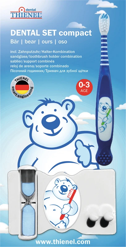 Das neue DENTAL SET compact (0-3) für die ganz Kleinen enthält eine speziell für die Altersgruppe entwickelte Zahnbürste mit ergonomischem Bürstengriff, extraweichen Borsten und Zahnungshilfe, eine Sanduhr und einen Zahnbürstenhalter.