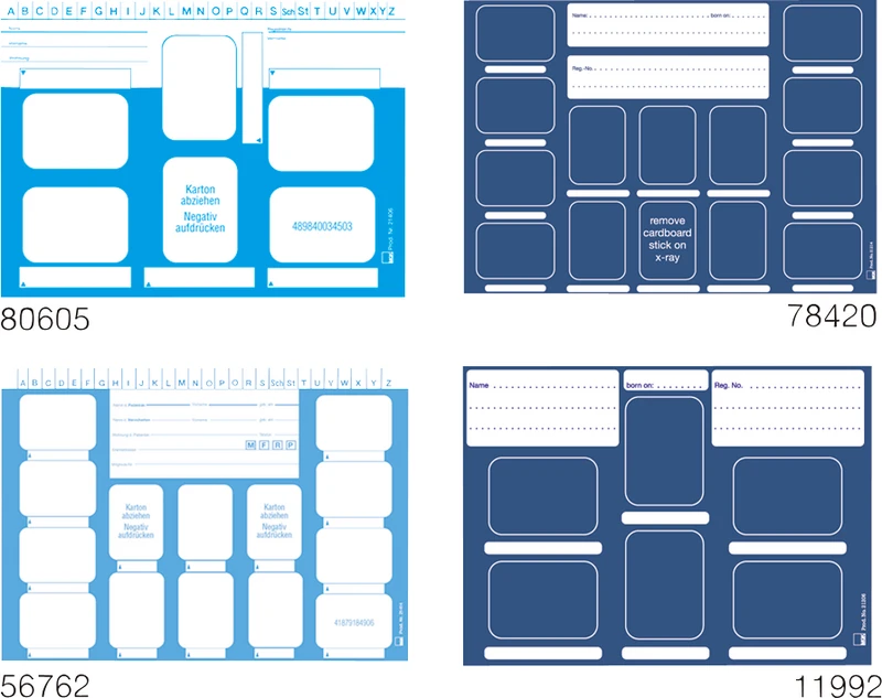Für Zahnfilme 3 x 4 cm aus hochwertigem Karton. Druck blau mit Selbstklebefolie. Die Positionierung der Filme erfolgt durch Andrücken, wodurch eine ausreichende Haftung erzielt wird. Die Karten haben DIN-Format mit guten Beschriftungsmöglichkeiten.