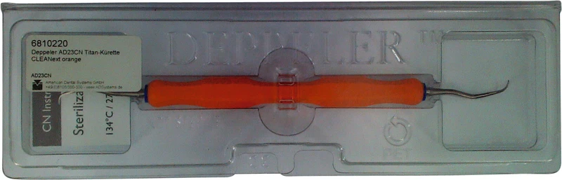 DEPPELER Titan-ImplantatkürettenWirksam ohne zu beschädigen: Die Implantatküretten bestehen aus purem Titan und sind etwas weniger hart als das Implantat, zur schadlosen Anwendung. Universalkürette aus Titan zur Zahnsteinentfernung an Titanimplantaten.