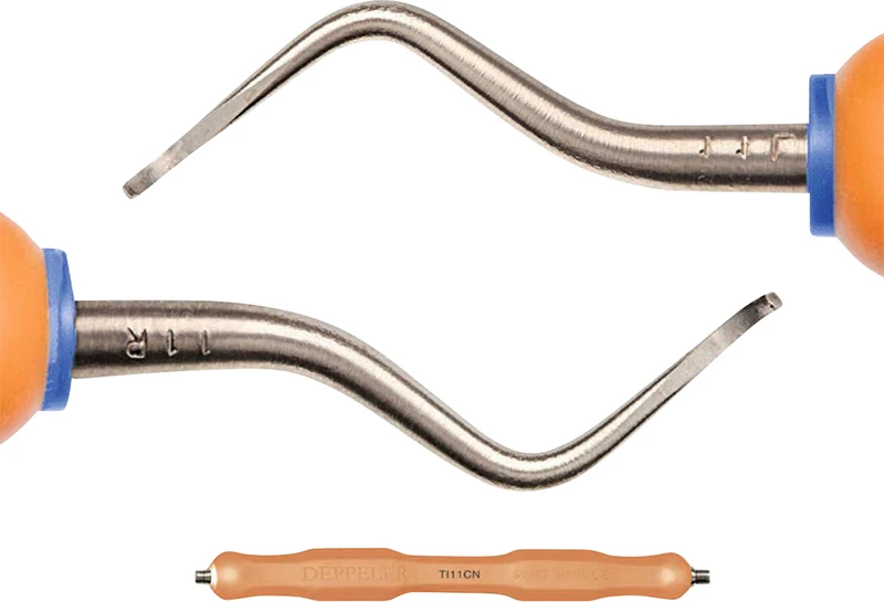 DEPPELER Titan-ImplantatkürettenWirksam ohne zu beschädigen: Die Implantatküretten bestehen aus purem Titan und sind etwas weniger hart als das Implantat, zur schadlosen Anwendung. Universalkürette aus Titan zur Zahnsteinentfernung an Titanimplantaten.