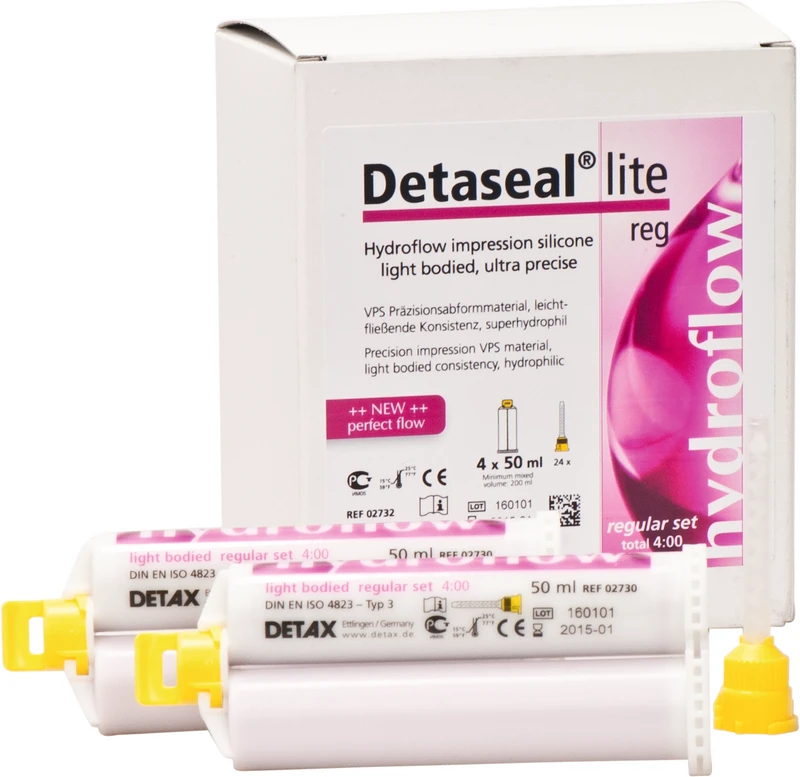 Produktinformationen "Detaseal® hydroflow lite Multipack 4 x 50 ml Doppelkartusche regular, 24 Mischkanülen gelb"