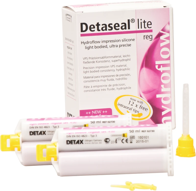 Produktinformationen "Detaseal® hydroflow lite Standardpackung 2 x 50 ml Doppelkartusche regular, 12 Mischkanülen gelb"