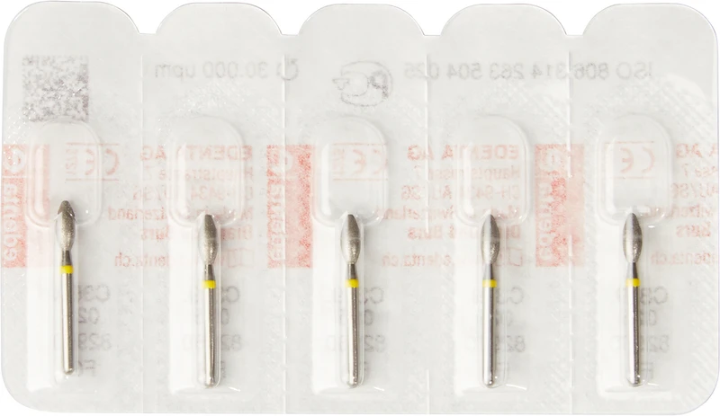 Produktinformationen "Diamanten 369 Packung 5 Stück gelb superfein, FG, Figur 263 Knospe, 5,5 mm, ISO 025"