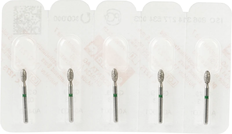 Produktinformationen "Diamanten 379 Packung 5 Stück grün grob, FG, Figur 277 Eiform, 4,5 mm, ISO 023"