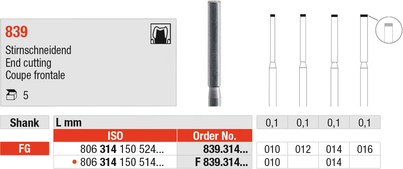 Diamanten 839 Packung 5 Stück Standard, FG, Figur 150 Stirnschneidend, 0,1 mm, ISO 016