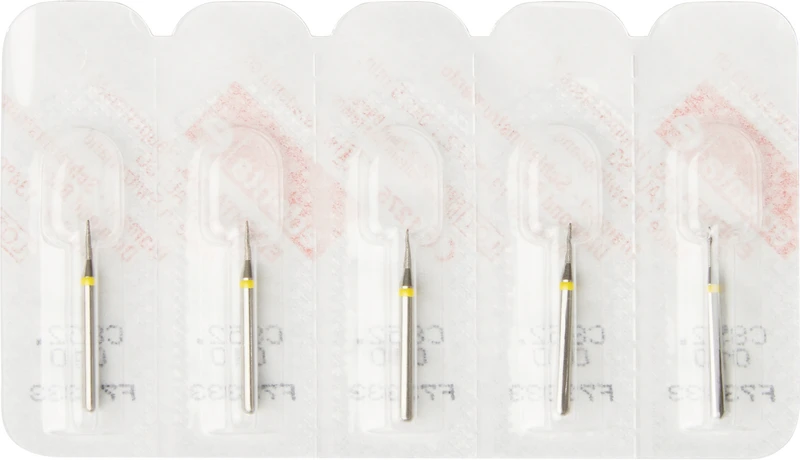 Produktinformationen "Diamanten 852 Packung 5 Stück gelb superfein, FG, Figur 164 Konus Spitze, 4mm, ISO 010"