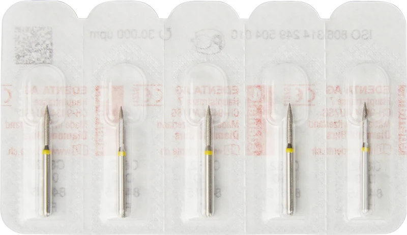 Diamanten 862 Packung 5 Stück gelb superfein, FG, Figur 249 Flamme, 8 mm, ISO 010