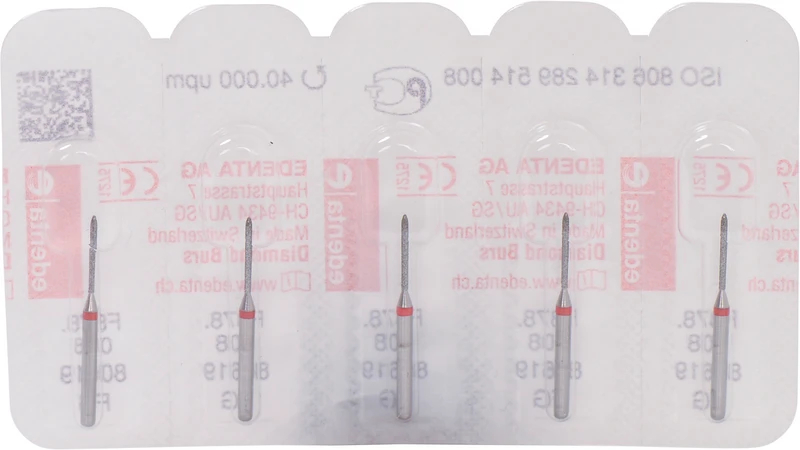 Packung 5 Diamanten rot fein, FG, Figur 289 Torpedo zylindrisch, Kopflänge: 8 mm, ISO 008