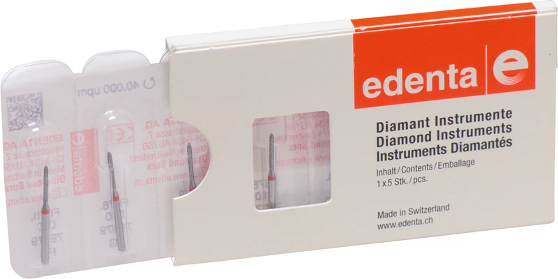 Packung 5 Diamanten rot fein, FG, Figur 289 Torpedo zylindrisch, Kopflänge: 8 mm, ISO 010