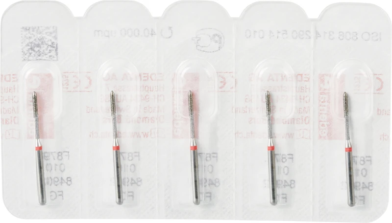 Produktinformationen "Diamanten 879 Packung 5 Stück rot fein, FG, Figur 290 Torpedo zylindrisch, 10 mm, ISO 010"