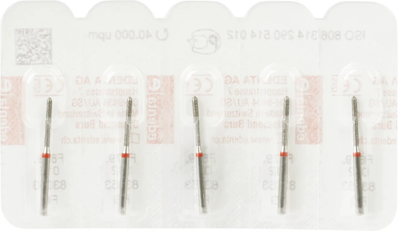 Produktinformationen "Diamanten 879 Packung 5 Stück rot fein, FG, Figur 290 Torpedo zylindrisch, 10 mm, ISO 012"