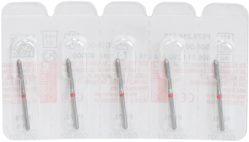 Produktinformationen "Diamanten 879 Packung 5 Stück rot fein, FG, Figur 290 Torpedo zylindrisch, 10 mm, ISO 016"