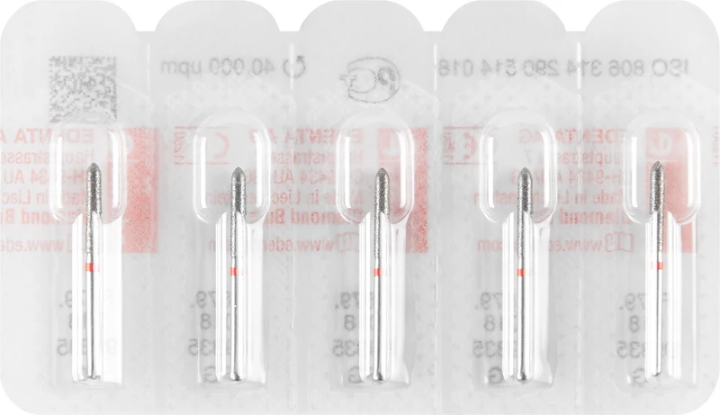 Produktinformationen "Diamanten 879 Packung 5 Stück rot fein, FG, Figur 290 Torpedo zylindrisch, 10 mm, ISO 018"