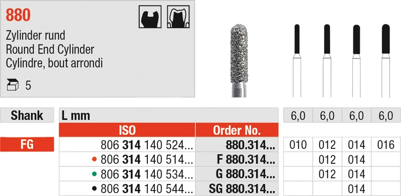 Diamanten 880 Packung 5 Stück Standard, FG, Figur 140 Zylinder rund, 6 mm, ISO 012