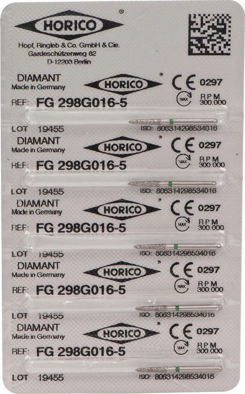 Produktinformationen "Diamantschleifer 298 Packung 5 Stück grün grob, FG, Figur 298, 8 mm, ISO 016"