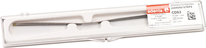 Einseitig belegte, autoklavierbare und wieder verwendbare Diamantstreifen in drei Körnungen (superfein = gelb, fein = rot, standard = blau) für eine sichere anatomische Gestaltung der approximalen Bereiche, zum Entfernen von Zementüberschüssen bei Inlays, Onlys sowie Veneers und für die kieferorthopädische Schmelzreduktion. Die 147 mm langen Streifen sind mit integrierter Sägeverzahnung, in perforierter Version und in zwei Breiten lieferbar.
