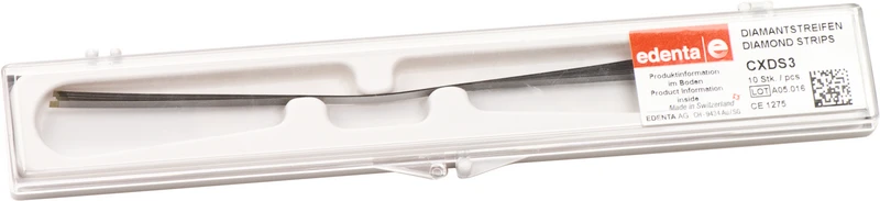 Einseitig belegte, autoklavierbare und wieder verwendbare Diamantstreifen in drei Körnungen (superfein = gelb, fein = rot, standard = blau) für eine sichere anatomische Gestaltung der approximalen Bereiche, zum Entfernen von Zementüberschüssen bei Inlays, Onlys sowie Veneers und für die kieferorthopädische Schmelzreduktion. Die 147 mm langen Streifen sind mit integrierter Sägeverzahnung, in perforierter Version und in zwei Breiten lieferbar.