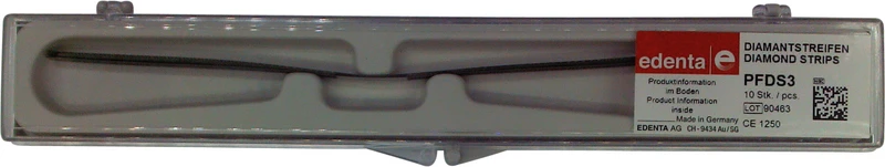 Einseitig belegte, autoklavierbare und wieder verwendbare Diamantstreifen in drei Körnungen (superfein = gelb, fein = rot, standard = blau) für eine sichere anatomische Gestaltung der approximalen Bereiche, zum Entfernen von Zementüberschüssen bei Inlays, Onlys sowie Veneers und für die kieferorthopädische Schmelzreduktion. Die 147 mm langen Streifen sind mit integrierter Sägeverzahnung, in perforierter Version und in zwei Breiten lieferbar.