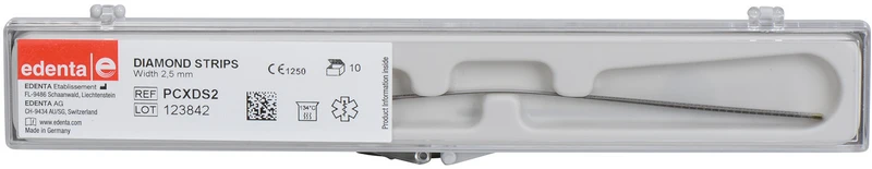 Einseitig belegte, autoklavierbare und wieder verwendbare Diamantstreifen in drei Körnungen (superfein = gelb, fein = rot, standard = blau) für eine sichere anatomische Gestaltung der approximalen Bereiche, zum Entfernen von Zementüberschüssen bei Inlays, Onlys sowie Veneers und für die kieferorthopädische Schmelzreduktion. Die 147 mm langen Streifen sind mit integrierter Sägeverzahnung, in perforierter Version und in zwei Breiten lieferbar.
