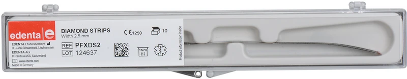 Einseitig belegte, autoklavierbare und wieder verwendbare Diamantstreifen in drei Körnungen (superfein = gelb, fein = rot, standard = blau) für eine sichere anatomische Gestaltung der approximalen Bereiche, zum Entfernen von Zementüberschüssen bei Inlays, Onlys sowie Veneers und für die kieferorthopädische Schmelzreduktion. Die 147 mm langen Streifen sind mit integrierter Sägeverzahnung, in perforierter Version und in zwei Breiten lieferbar.