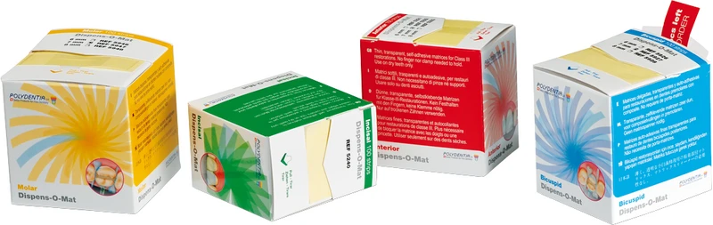 Selbstklebende Matrizen aus transparentem Polyester, kein Matrizenhalter nötig.