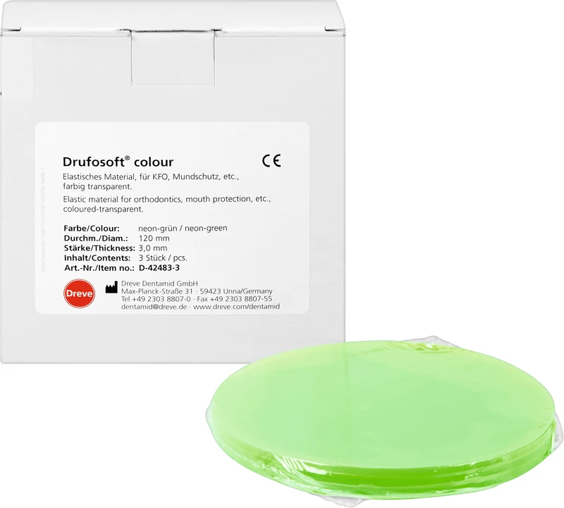 Tiefziehfolie aus Ethylen-Vinylacetat. Weich-elastisch mit hoher Rückstellkraft bei einer Endhärte von 82 Shore A. Laminierbar und bestens geeignet für individuellen Sportmundschutz wie den Dreve Mouthguard, Positioner und Dublierformen.