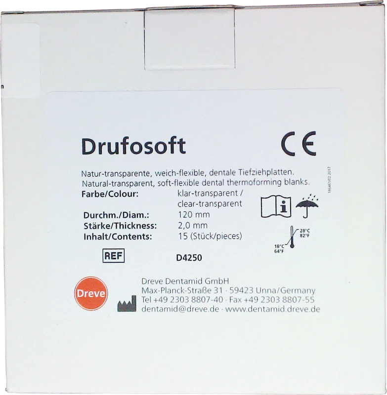 Tiefziehfolie aus Ethylen-Vinylacetat. Weich-elastisch mit hoher Rückstellkraft bei einer Endhärte von 82 Shore A. Laminierbar und bestens geeignet für individuellen Sportmundschutz wie den Dreve Mouthguard, Positioner und Dublierformen.