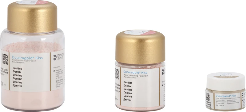 Duceragold®Kiss ist die Verblendkeramik für hochexpansive Legierungen im WAK Bereich von 16,2-17,6 m/m K und Bestandteil des bekannten und seit über 15 Jahren bewährten GoldenGate Systems. Duceragold®Kiss ist gleichermaßen für das Verblenden der Presskeramik Cergo Kiss indiziert. Eine Verblendkeramik mit zweifachem Nutzen. Sowohl das Erscheinungsbild als auch die Materialeigenschaften und die glatte Oberfläche mit einem naturkonformen Abrasionsverhalten entsprechen dem natürlichen Zahn.