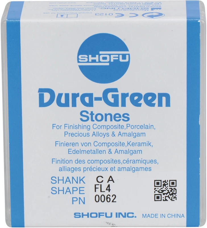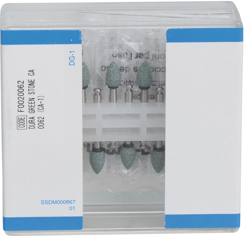 Dura-Green Steine sind aus hochwertigem Siliziumkarbid hergestellt und außergewöhnlich gut geeignet für das schnelle, splitterfreie Konturieren und Finieren von Keramik, Komposit, Edelmetalllegierungen und Amalgam.