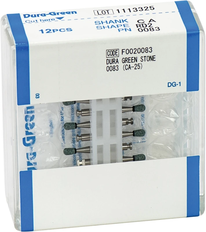 Dura-Green Steine sind aus hochwertigem Siliziumkarbid hergestellt und außergewöhnlich gut geeignet für das schnelle, splitterfreie Konturieren und Finieren von Keramik, Komposit, Edelmetalllegierungen und Amalgam.