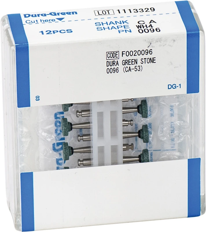 Dura-Green Steine sind aus hochwertigem Siliziumkarbid hergestellt und außergewöhnlich gut geeignet für das schnelle, splitterfreie Konturieren und Finieren von Keramik, Komposit, Edelmetalllegierungen und Amalgam.