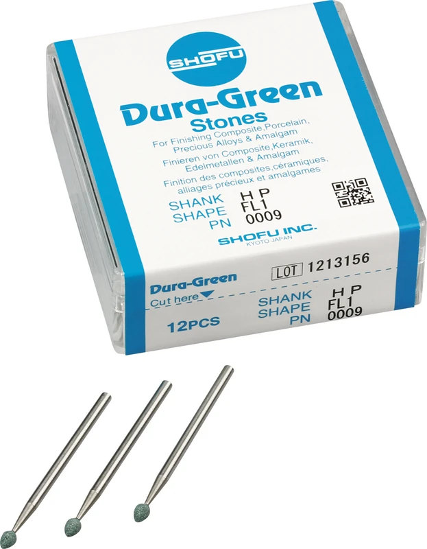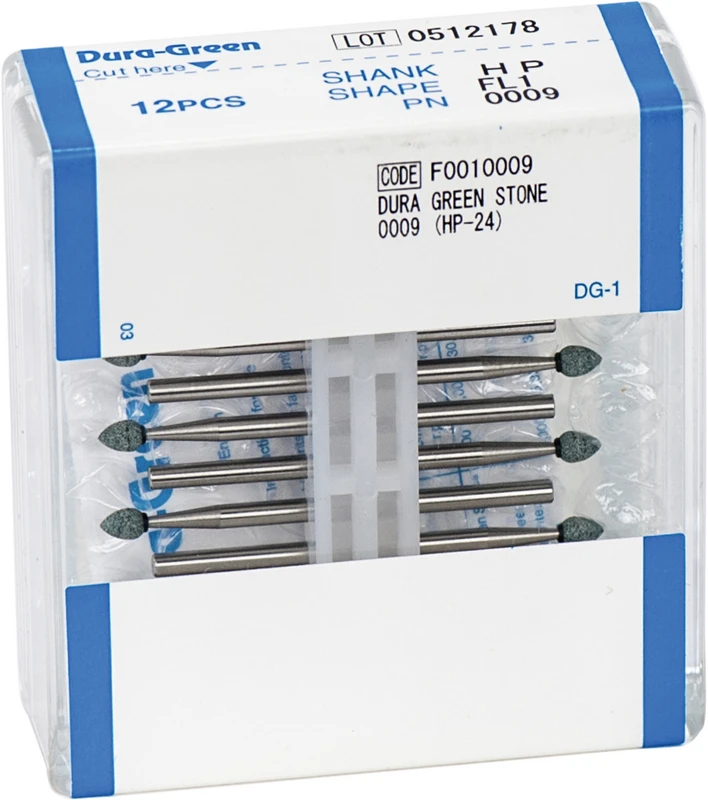 Dura-Green-Steine eignen sich hervorragend zum splitterfreien Ausarbeiten von Keramik, Komposit, Edelmetall und Amalgam. Empfohlene Drehzahl 5.000 - 20.000 U/min., max. Drehzahl 30.000 U/min. / AD 3 - 5 N.