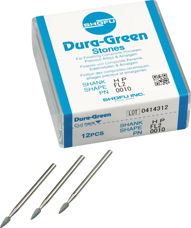 Dura-Green-Steine eignen sich hervorragend zum splitterfreien Ausarbeiten von Keramik, Komposit, Edelmetall und Amalgam. Empfohlene Drehzahl 5.000 - 20.000 U/min., max. Drehzahl 30.000 U/min. / AD 3 - 5 N.