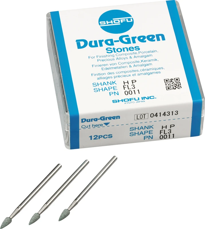 Dura-Green-Steine eignen sich hervorragend zum splitterfreien Ausarbeiten von Keramik, Komposit, Edelmetall und Amalgam. Empfohlene Drehzahl 5.000 - 20.000 U/min., max. Drehzahl 30.000 U/min. / AD 3 - 5 N.