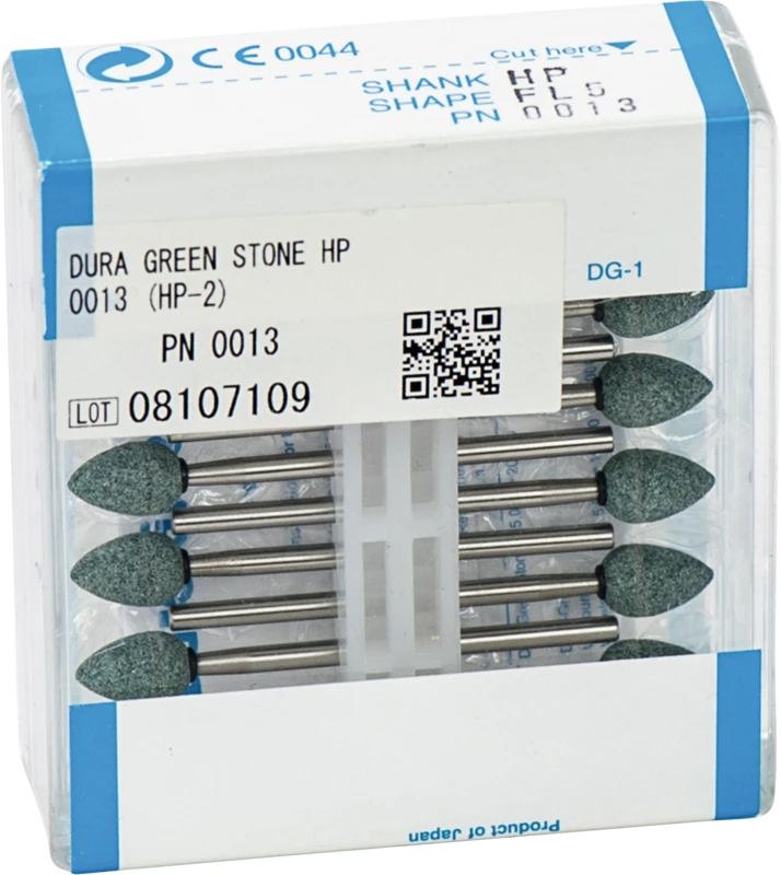 Dura-Green-Steine eignen sich hervorragend zum splitterfreien Ausarbeiten von Keramik, Komposit, Edelmetall und Amalgam. Empfohlene Drehzahl 5.000 - 20.000 U/min., max. Drehzahl 30.000 U/min. / AD 3 - 5 N.