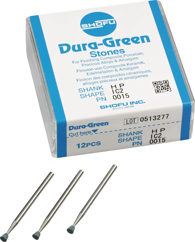 Dura-Green-Steine eignen sich hervorragend zum splitterfreien Ausarbeiten von Keramik, Komposit, Edelmetall und Amalgam. Empfohlene Drehzahl 5.000 - 20.000 U/min., max. Drehzahl 30.000 U/min. / AD 3 - 5 N.