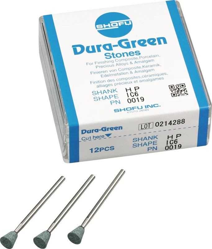Dura-Green-Steine eignen sich hervorragend zum splitterfreien Ausarbeiten von Keramik, Komposit, Edelmetall und Amalgam. Empfohlene Drehzahl 5.000 - 20.000 U/min., max. Drehzahl 30.000 U/min. / AD 3 - 5 N.